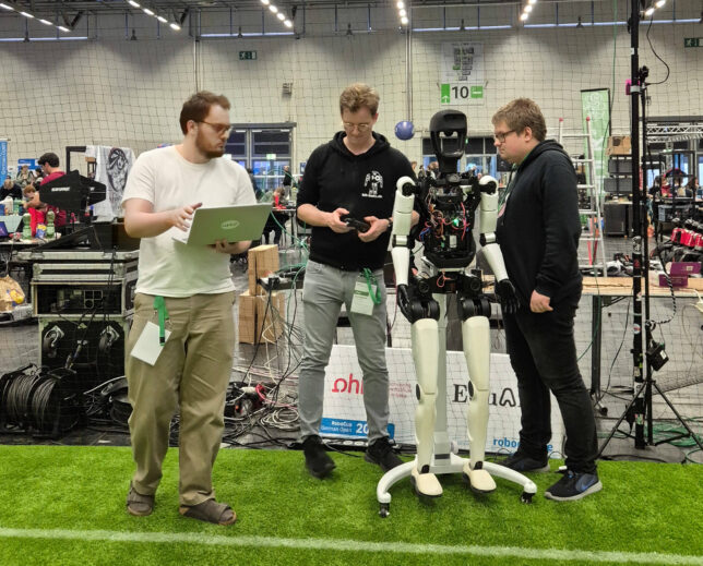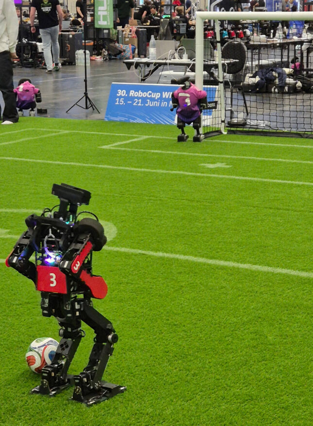 Diese Entwicklung passt auch zu den strukturellen Veränderungen im RoboCup: Die Humanoid League und die Standard Platform League wurden zur neuen Humanoid Soccer League zusammengeführt. Diese ist nun in drei Divisionen unterteilt: Small, Middle und Large. Wir traten mit unseren „Wolfgang“-Robotern in der Small Division an, während der X02 künftig in der Large Division eingesetzt werden soll.