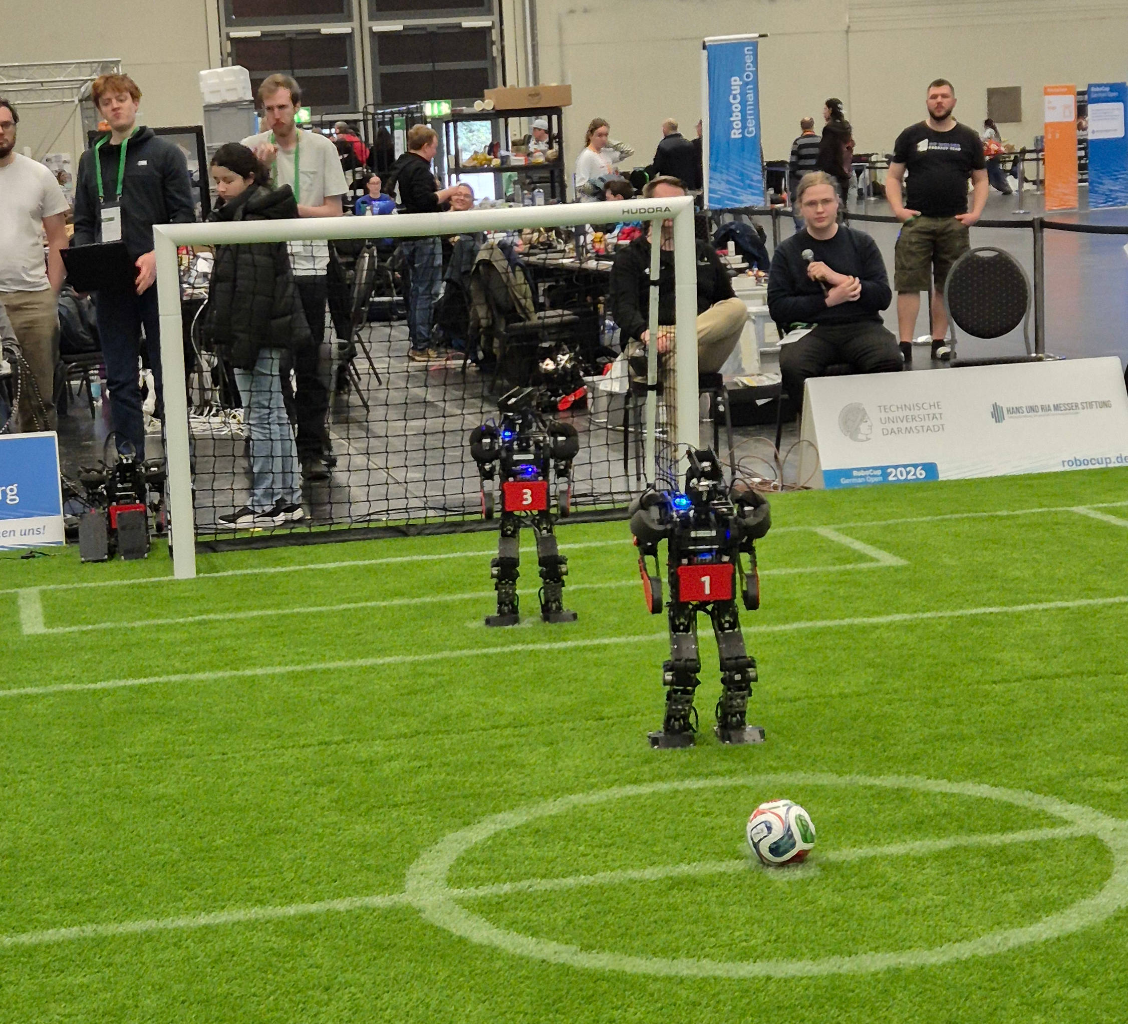Dank unserer großen Teamstärke konnten wir uns nicht nur auf die Spiele konzentrieren. Einige von uns haben die Matches moderiert, wodurch unsere Spiele mehrmals im offiziellen Stream: https://www.youtube.com/@robocupgermany/streams gezeigt wurden. Zudem haben andere Bit-Bots Mitglieder parallel an Reinforcement-Learning-Ansätzen für den Wolfgang gearbeitet haben.