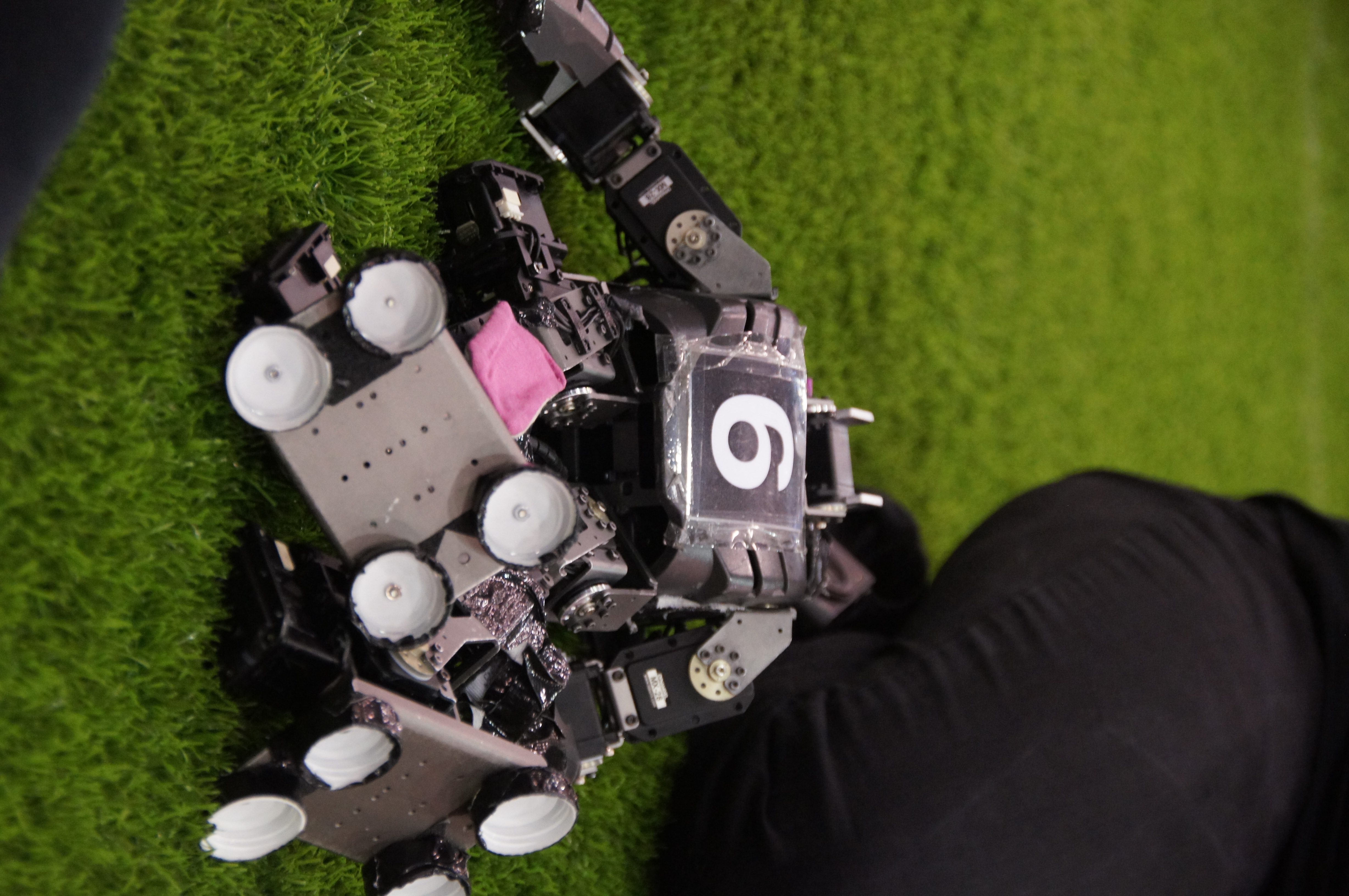 Auch die Probleme der Darwins beim Laufen schienen sich nur mit Hardwaremodifikationen lösen zu lassen. Da wir ja bereits auf den German Open verschiedene Möglichkeiten für die Füße ausprobiert hatten, kamen wir schnell zu einer Lösung: Flaschendeckel sollten es sein. Diese schraubten wir mit der Öffnung nach unten unter die Darwinfüße, sodass sich der Umfang der Fußsohle nicht verkleinert, aber die Roboter mehr Halt im hohen Kunstrasen finden. Damit kamen wir plötzlich relativ gut voran.