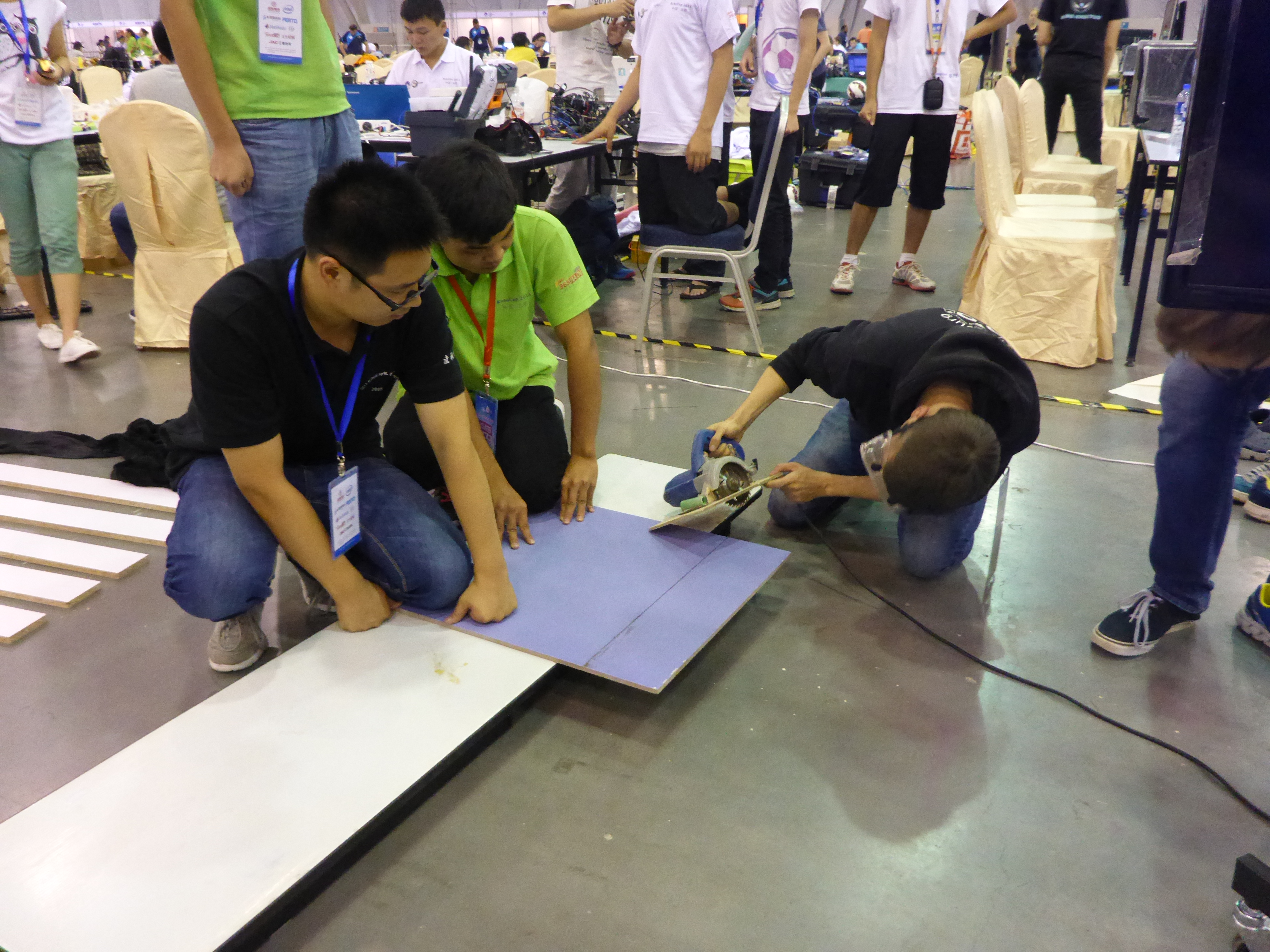 Als wir zurück in die Halle kamen, hatten einige von uns eine große Keramikfliese organisiert und wollten daraus Platten basteln, die man unter den Füßen der Hambots montieren könnte. Dies sollte den den Schwerpunkt der Roboter nach unten verlagern und so mehr Standfestigkeit bringen. Doch wie schneidet man zwei gleichgroße Quadrate aus einer Fliese ohne richtiges Werkzeug? Die hilfsbereiten Volunteers konnten uns zwar eine Kreissäge besorgen, diese war jedoch nur für Holz geeignet und schmolz unter dem harten Keramik dahin. So blieb uns nichts anderes übrig, als zu versuchen die Fliese an einer scharfen Kannte durchzubrechen. Das klappte erstaunlich gut, zog aber die Blicke aller Umstehenden auf sich.