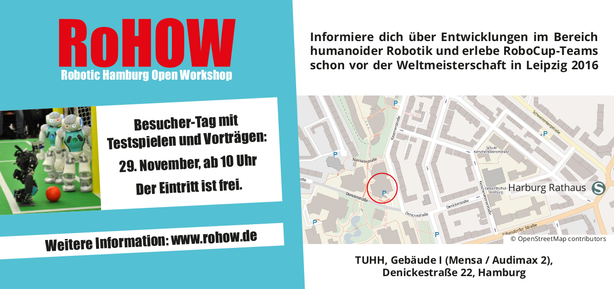 Nächste Woche ist es wieder soweit, wir veranstalten zusammen mit den HULKs unseren RoHOW (Robotic Hamburg Open Workshop). Wir erwarten vom Freitag dem 27.11.15 bis Sonntag den 29.11.15 Teams aus ganz Europa.
