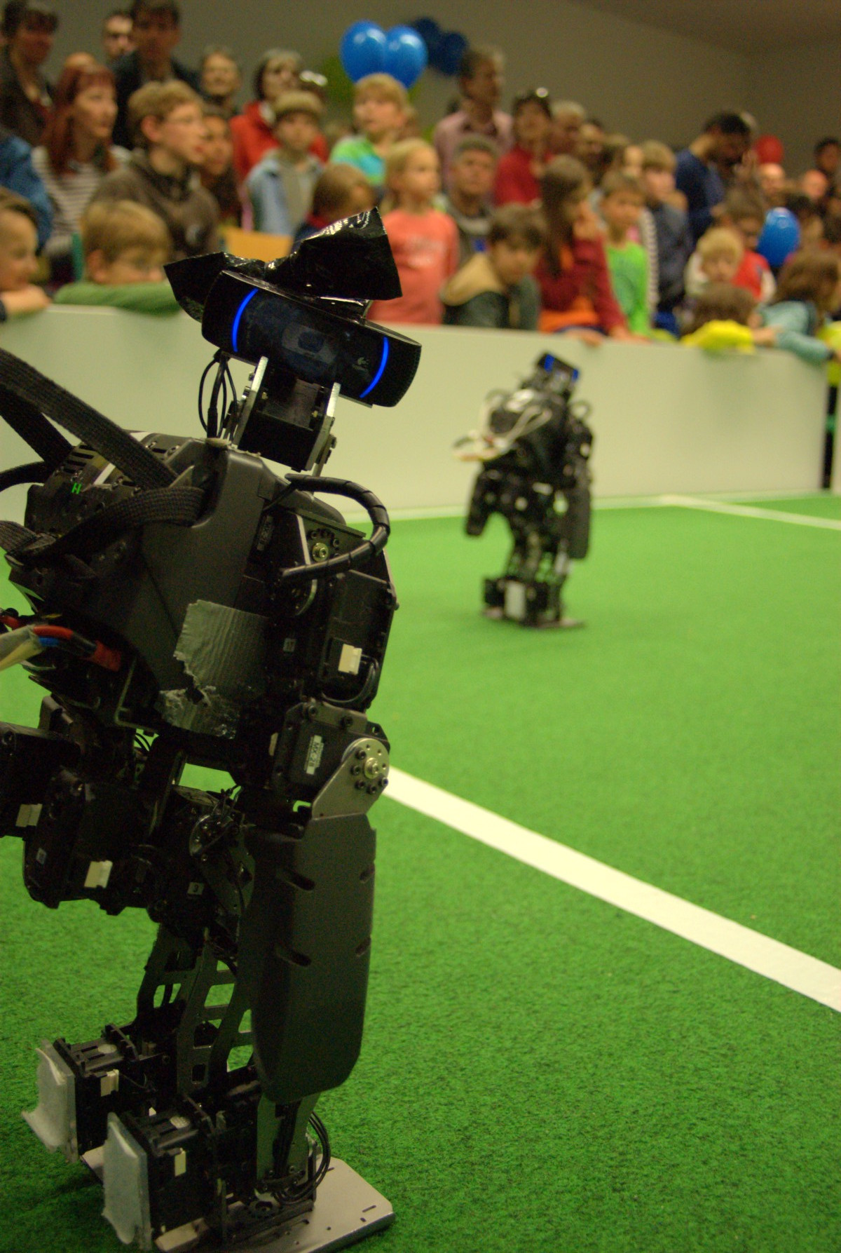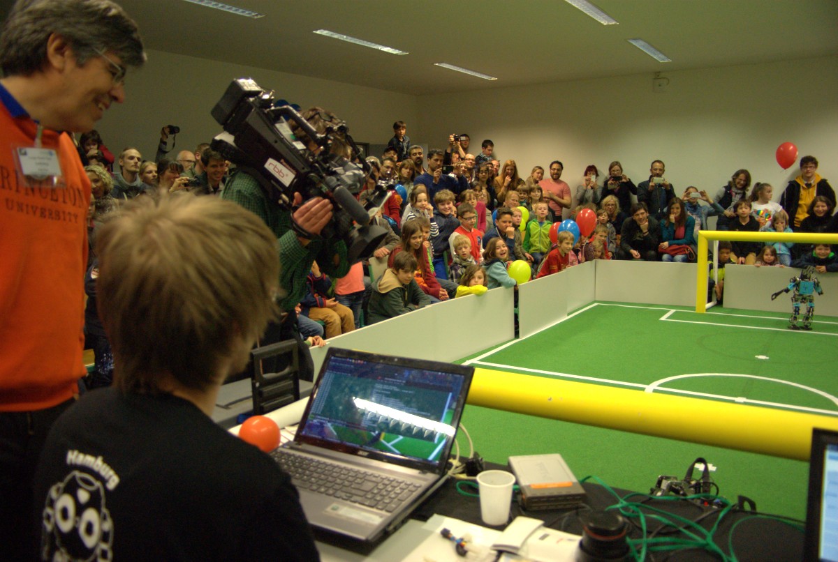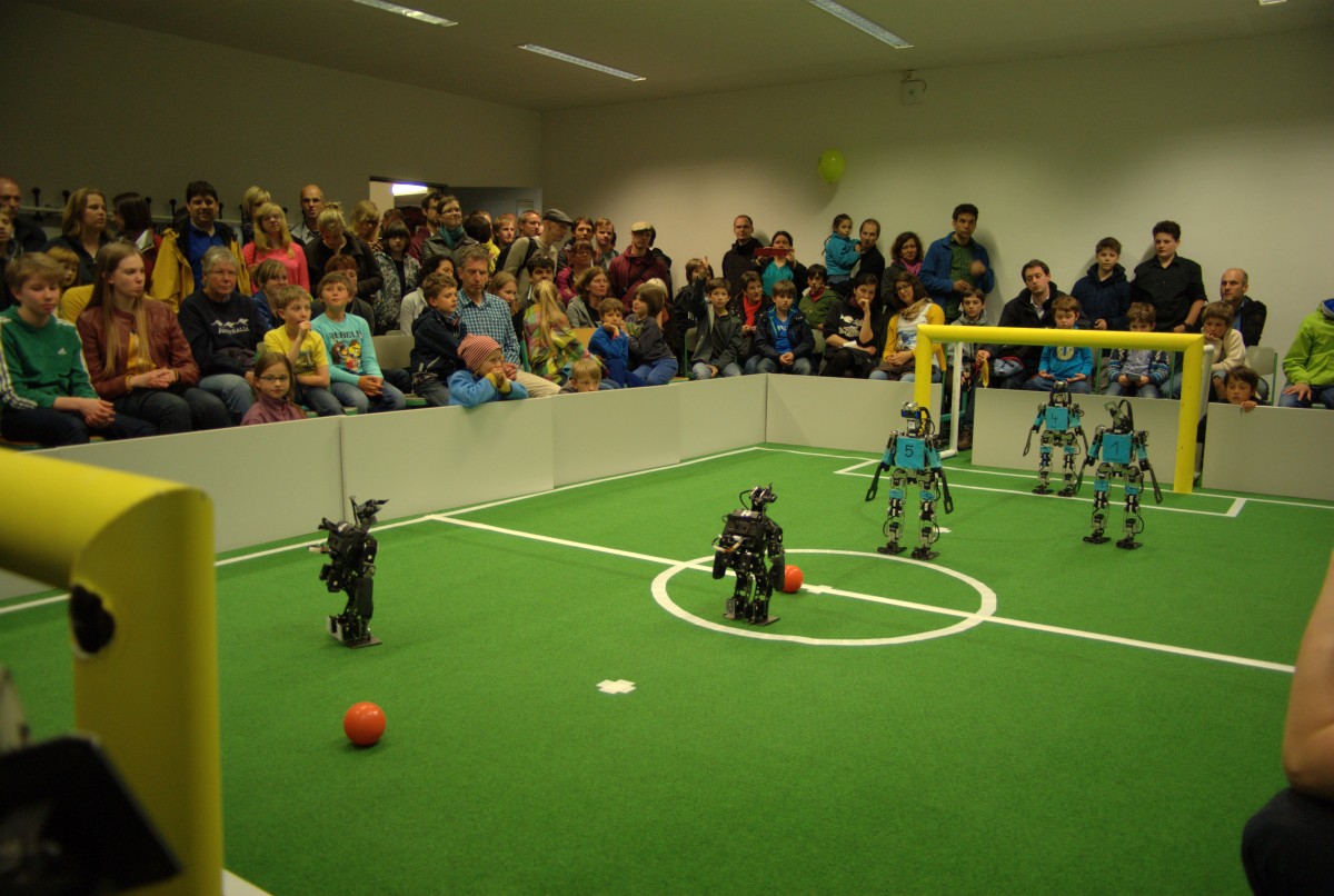 Am Samstag waren wir bei den FUmanoids auf der 14. Nacht der Wissenschaft in Berlin. Die Nacht war das erste Treffen mit den FUmanoids nach den Iran Open, und der erste größere Test unserer Software. Ab 16:30 haben wir stündlich gegen die FUmanoids gespielt und kontinuierlich unsere Software verbessert. Zwischen den Spielen wurden wir immer wieder nach den nächsten Spielen gefragt und konnten mit den Spielen und auch mit Präsentationen der Roboter das interessierte Publikum begeistern. Wir spielten meistens vor „vollem Haus“. Diese Gelegenheit wurde auch vom Professor bei den FUmanoids und dem RBB genutzt. Im Nachhinein der Nacht des Wissenschaft konnten wir Daniel auch noch sein Geschenk für „Nettigkeiten“ im Iran überreichen.