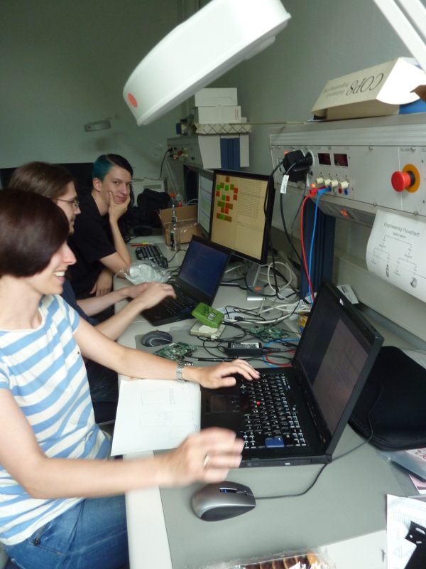 Das Team befindet sich zur Zeit in der Wettkampfvorbereitung und hat das Camp in F132 bezogen. Es gibt ein ewiges Frühstück und eine kleine Bibliothek, nur leider wird das neue Spielfeld in Originalgröße erst am 13.03.12 geliefert. Bis zum Beginn der German Open wird der größte Teil des Teams täglich von ca. 9-21Uhr an der Optimierung der Roboter-Software arbeiten. Interessierte können gern vorbei schauen.