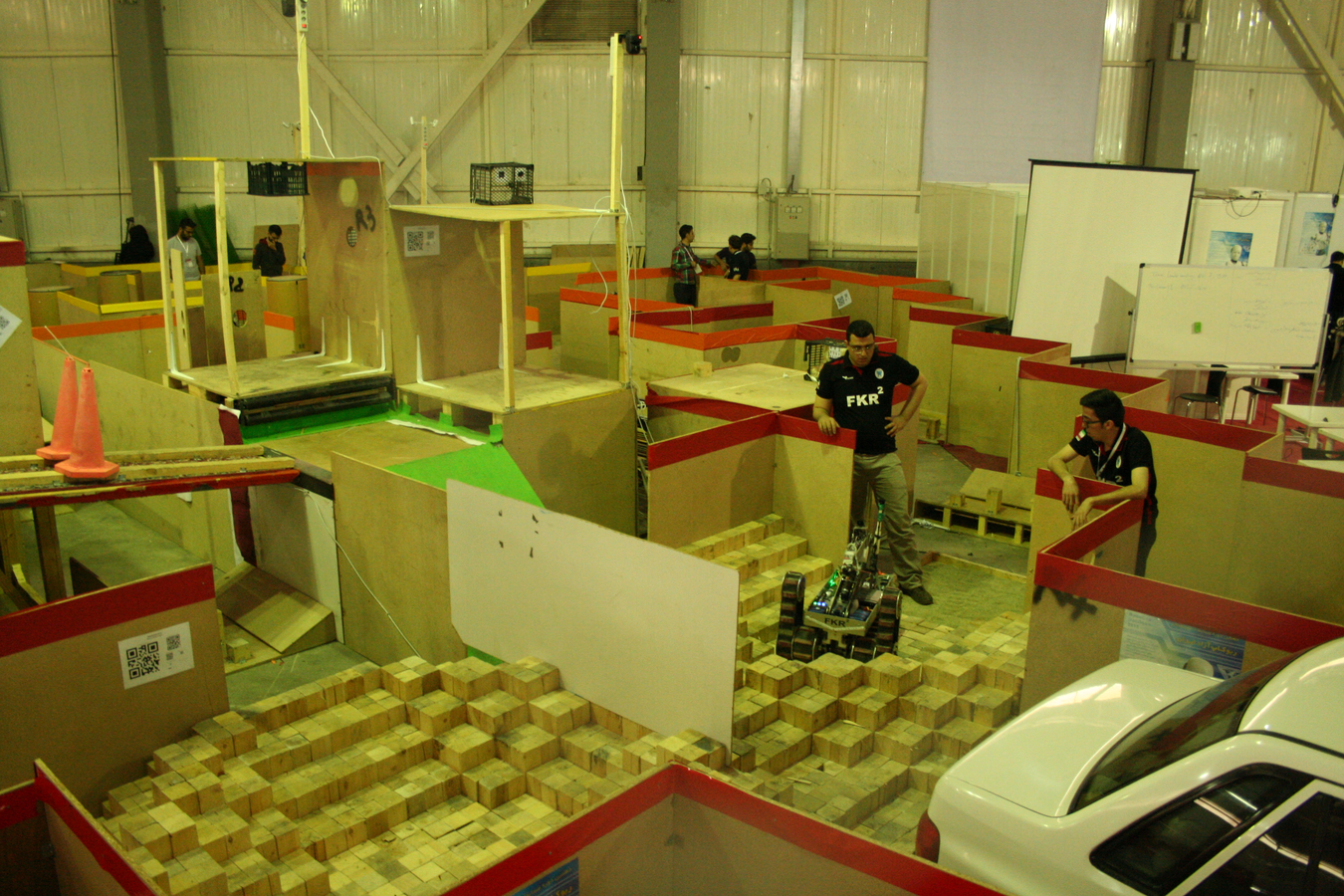Gestern Abend bekamen wir die Nachricht, dass wir die Halle um 18:00 Uhr zu räumen hätten. Alles würde durchsucht werden es käme eine „highly important person“. Kein Gegenstand, den wir am nächsten Tag brauchen würden dürfte aus der Halle genommen werden. Für alle Teams ein ziemliches Problem, da wir abends zumindest die Laptops zum arbeiten brauchen würden. Unsere Entscheidung war daraufhin Roboter und drei Laptops in der Halle zu lassen und den Rest der Laptops mit ins Hotel zu nehmen.