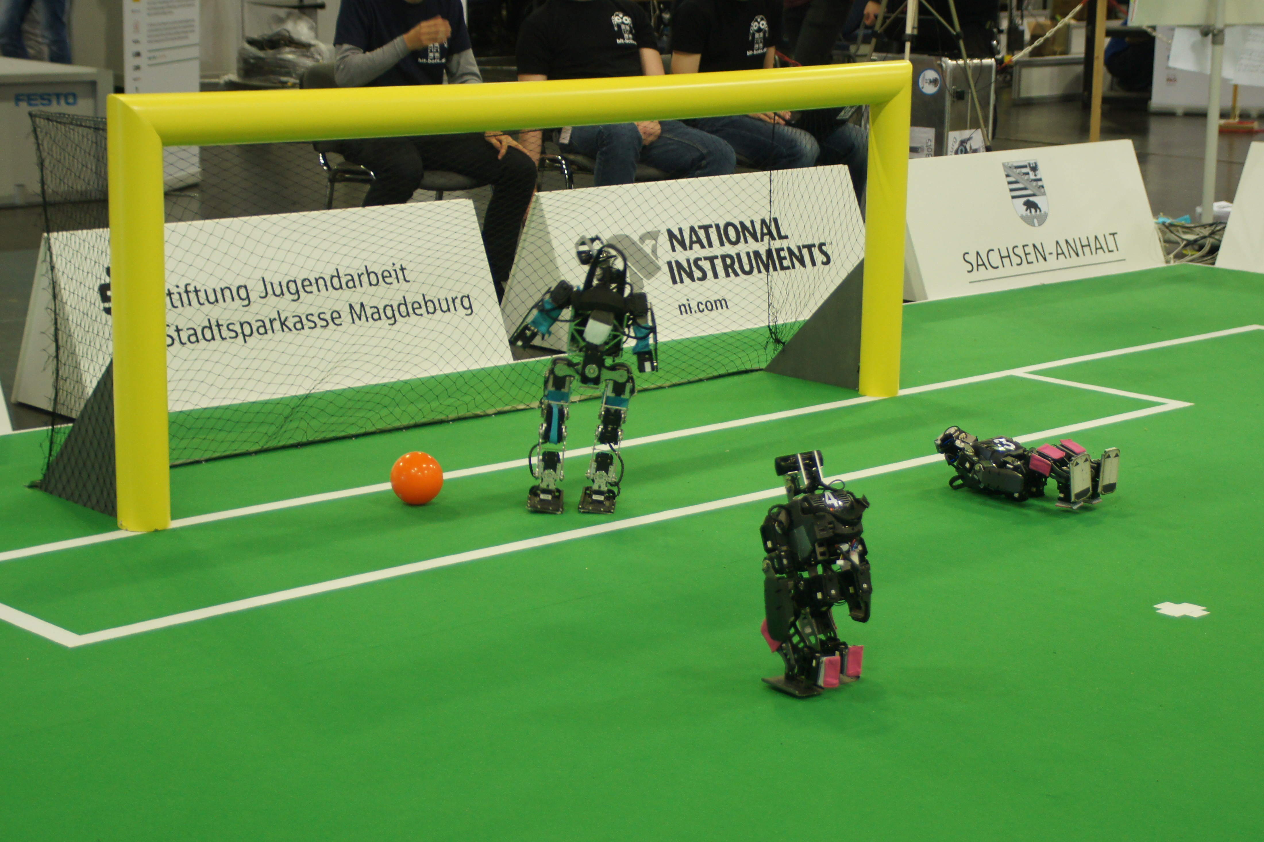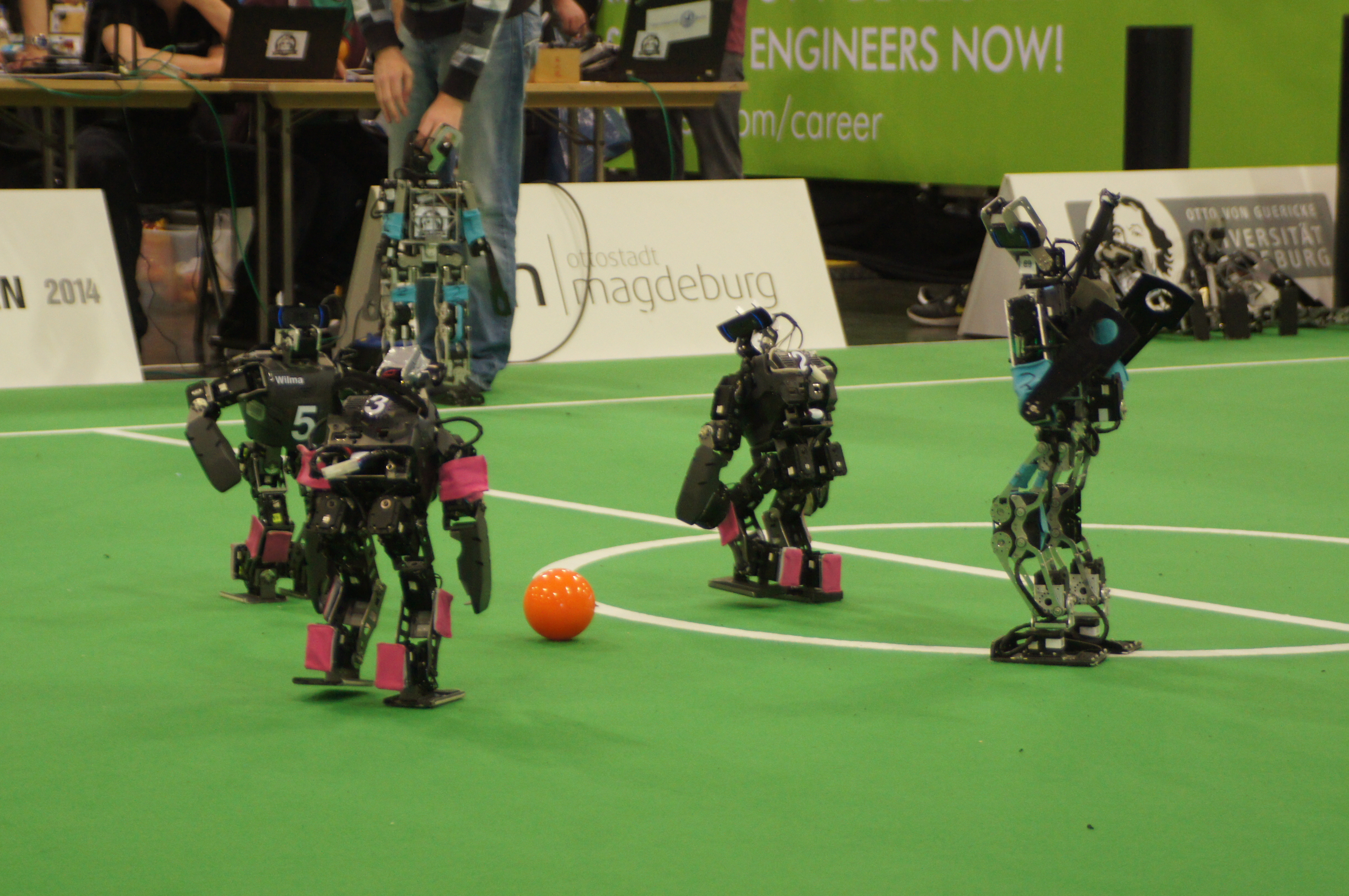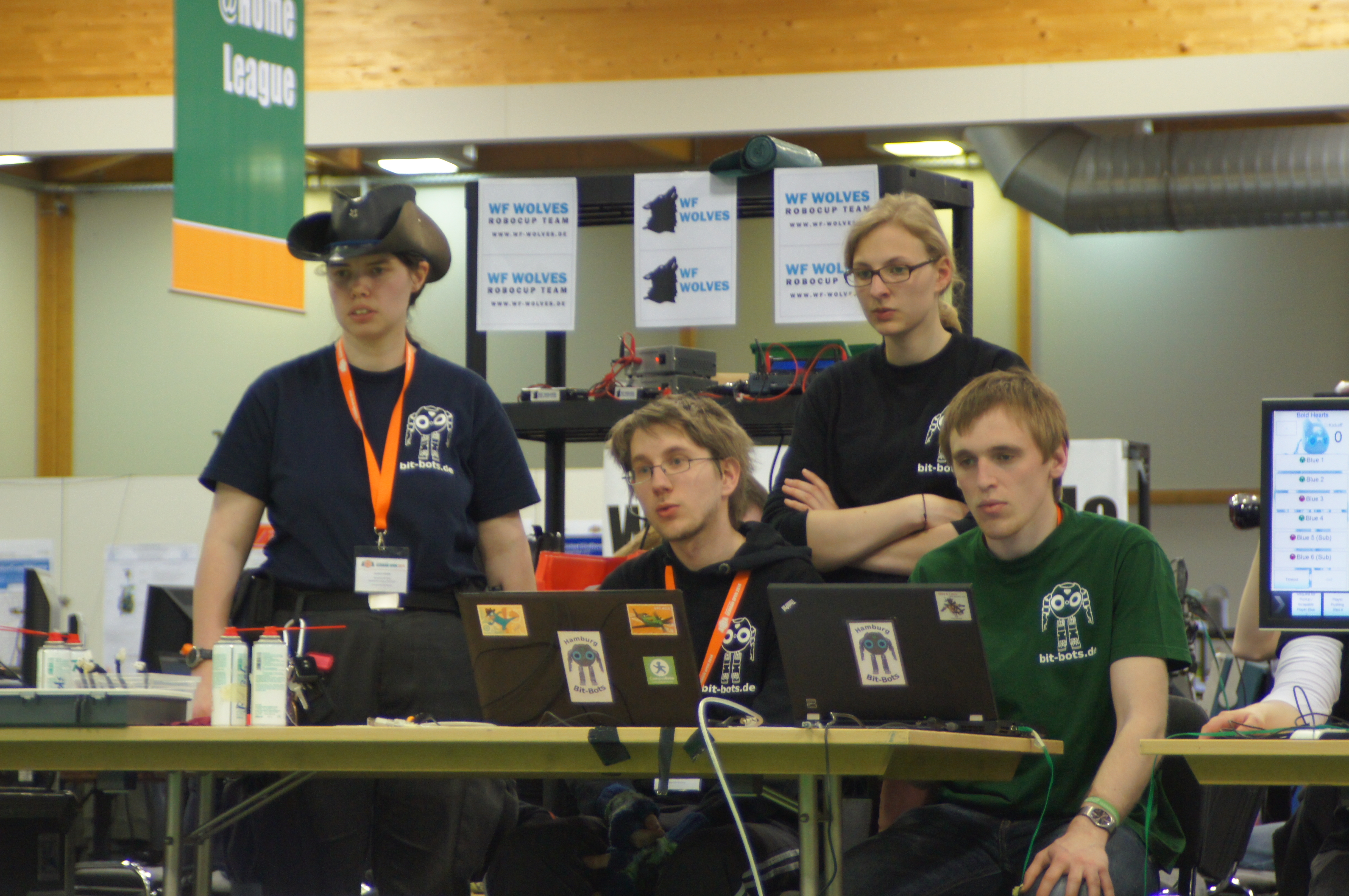 Auf den Weltmeisterschaften werden häufig auch Demospiele in gemischen Teams veranstaltet. Wir haben uns mit den Bold Hearts zu einem Team zusammengeschlossen und gegen das Team Rhoban Football Club aus Frankreich gespielt. Wir haben einen Torwart, einen Defender und einen Feldspieler gestellt, die Bold Hearts ebenfalls zwei Feldspieler. Aus dem französischen Team waren nur drei Roboter auf dem Platz. Das Spiel begann sehr gut mit einem Anstoß für unser Team, der weit ins gegnerische Feld ging. Dann machte sich jedoch direkt bemerkbar, dass die Kommunikation unter den Teams noch nicht perfektioniert ist. Es gab nicht nur Absprachenprobleme zwischen den drei Feldspielern sondern auch mit dem Torwart. Ersteres sorgte dafür, dass ab und zu alle drei Feldpsieler des eigenen Teams sich um den Ball stritten, zweiteres dafür, dass wir ab und zu auf unser eigenes Tor spielten. Am Ende ging es 3:2 für das Team Rhoban Football Club aus, wobei wir für zwei von den drei Gegentoren selbst sorgten und das dritte vorbereiten. Zur Verteidigung unseres Torwarts muss gesagt werden, dass er zumindest einmal den Ball direkt im Rücken hatte und daher auch nicht halten konnte.