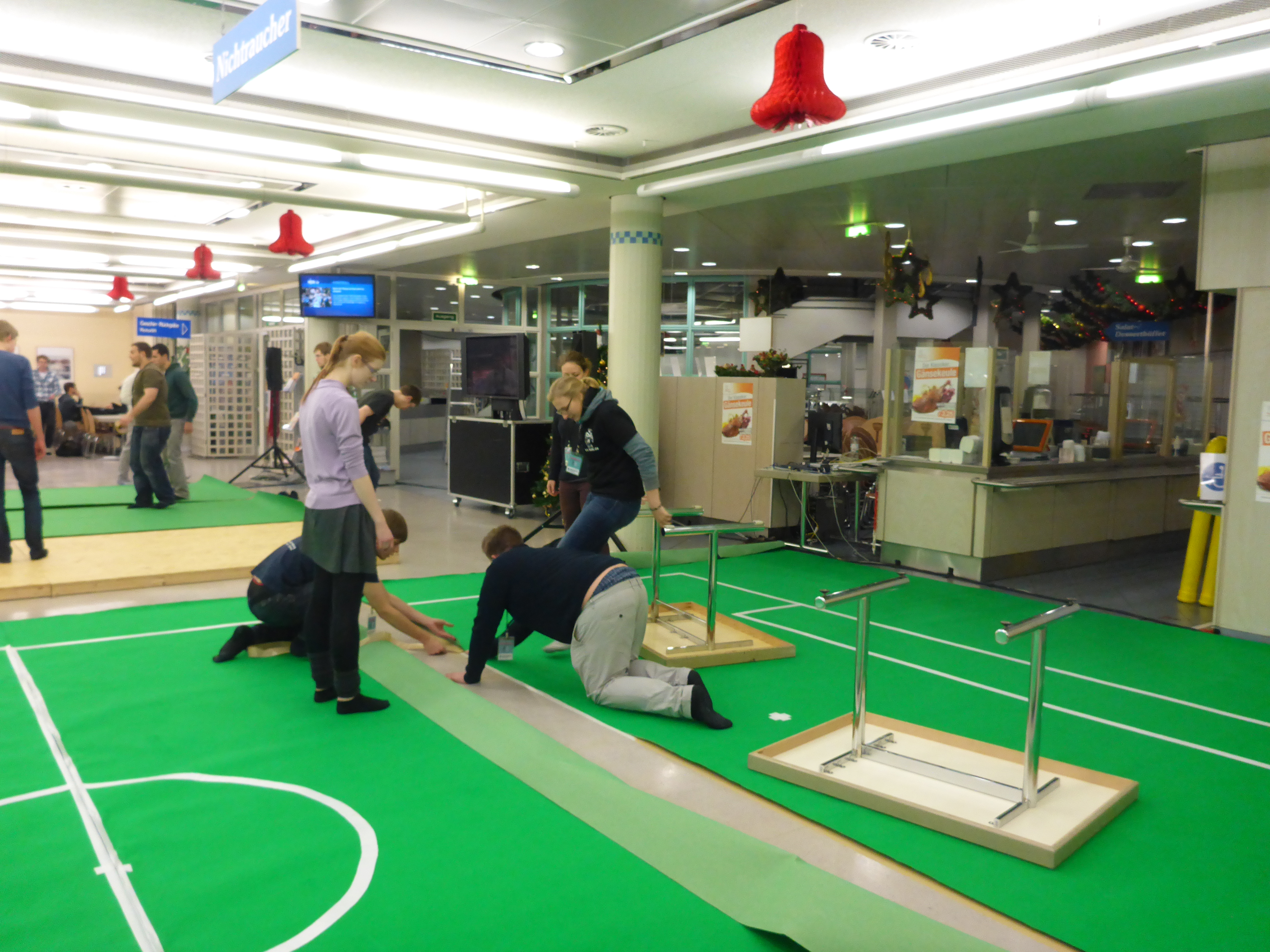 Nach kurzem Warten wurde uns dann der Zugang zur Mensa gewährt in der die Felder aufgebaut werden. Es gab ein paar erstaunte Blicke von Studierenden die zu späteren Zeit noch ihr Mittag genossen, was aber keine Probleme bereitete.