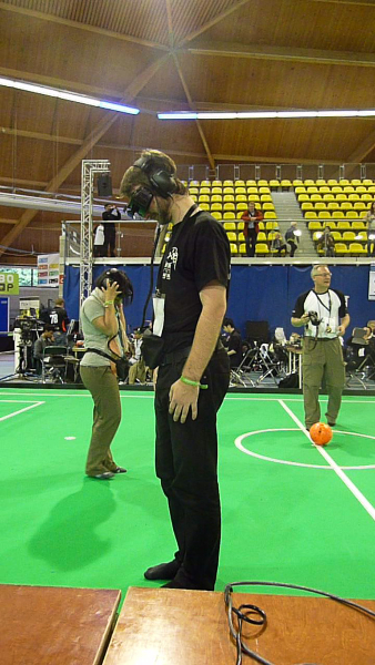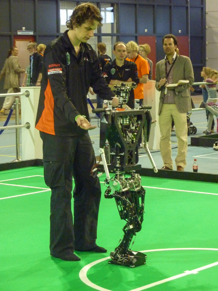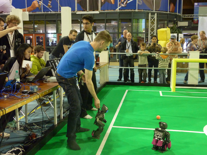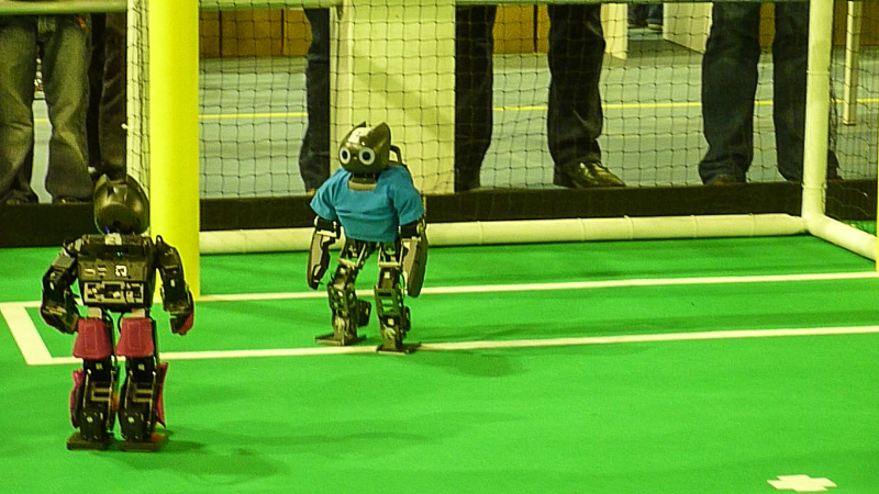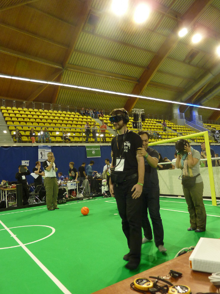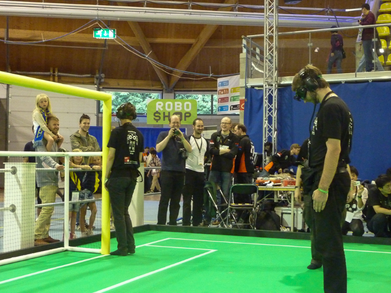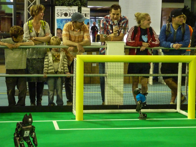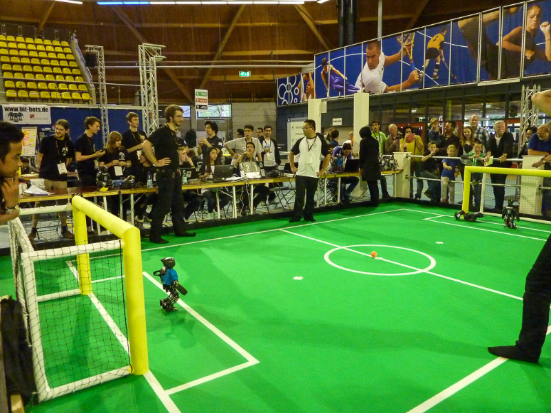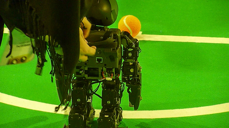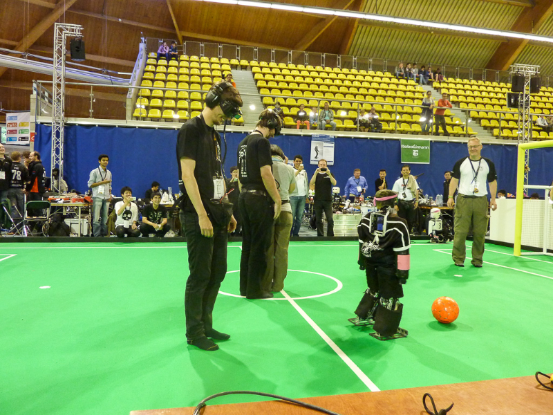 Von den Menschen auf dem Feld gelang niemandem eine nennenswerte Aktion, abgesehen von mehreren amüsanten Karambolagen und Pirouetten um die eigene Achse. Später wurde jedoch ein Roboter aus der Teen-Sized-League mit auf das Feld gelassen, der die menschlichen Spieler (im direkten Vergleich) dann auch prompt aus-dribbelte und ein Tor schoss.