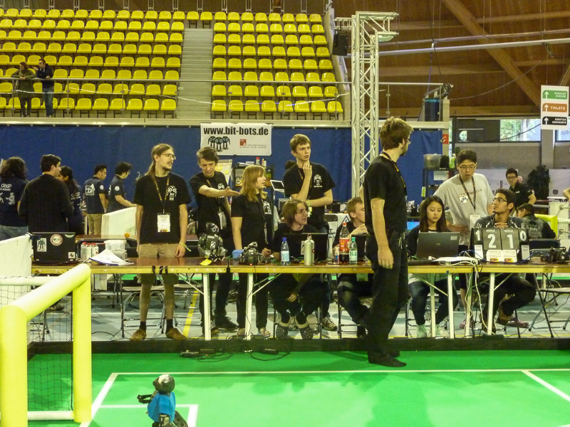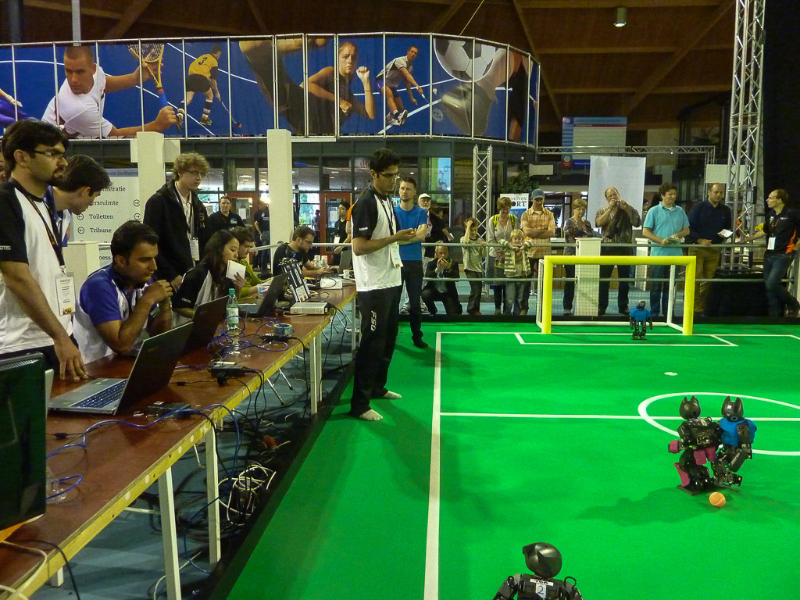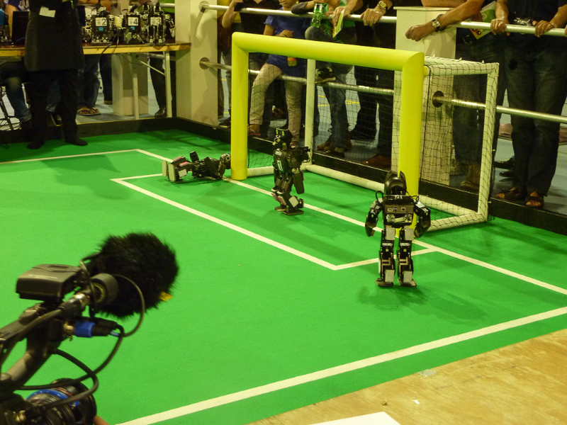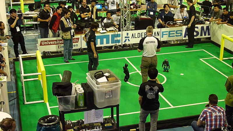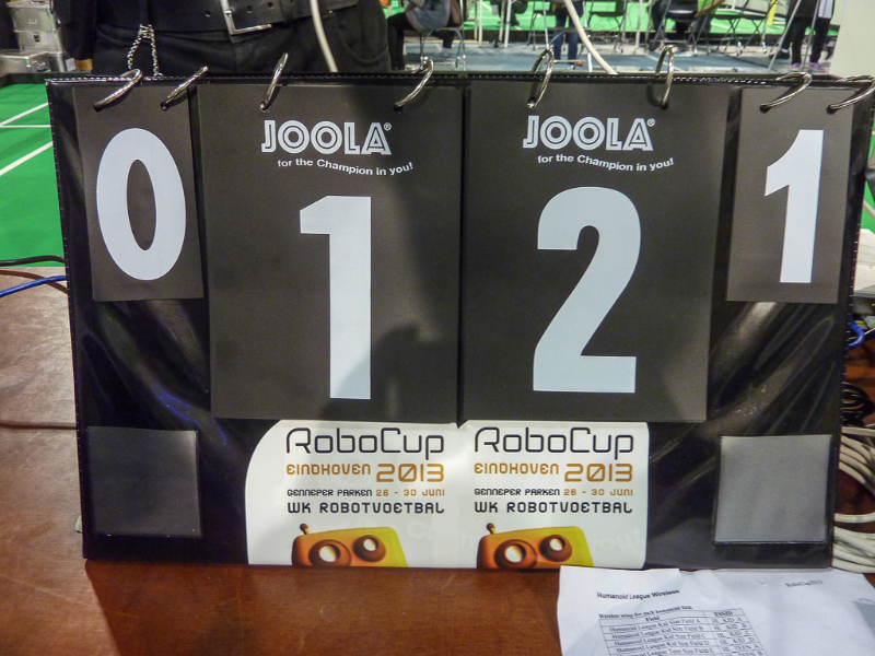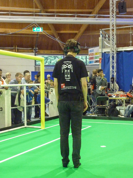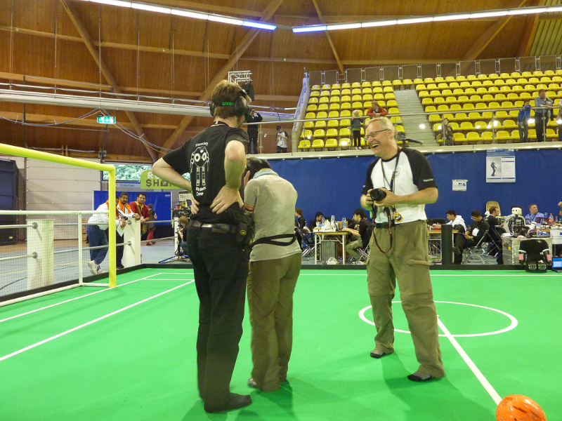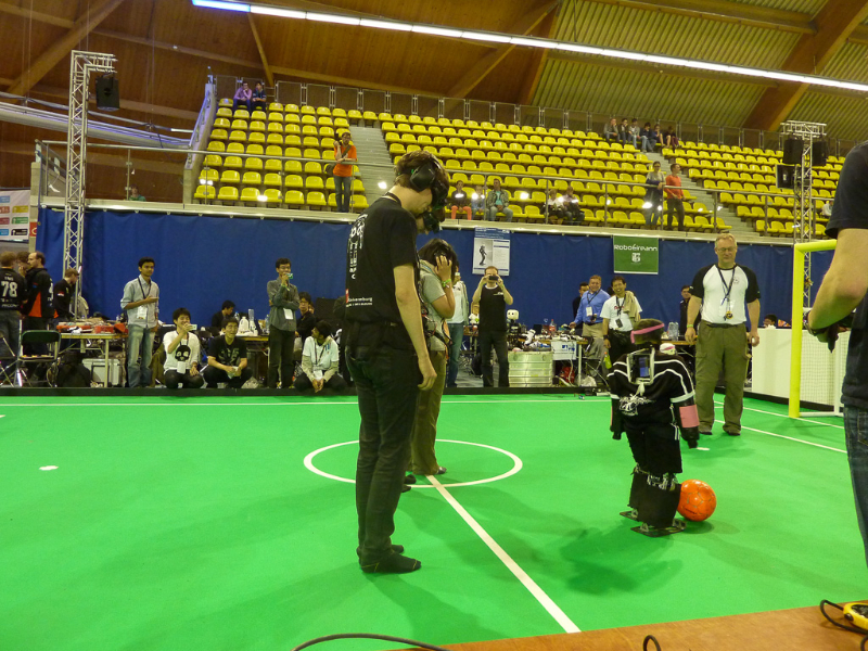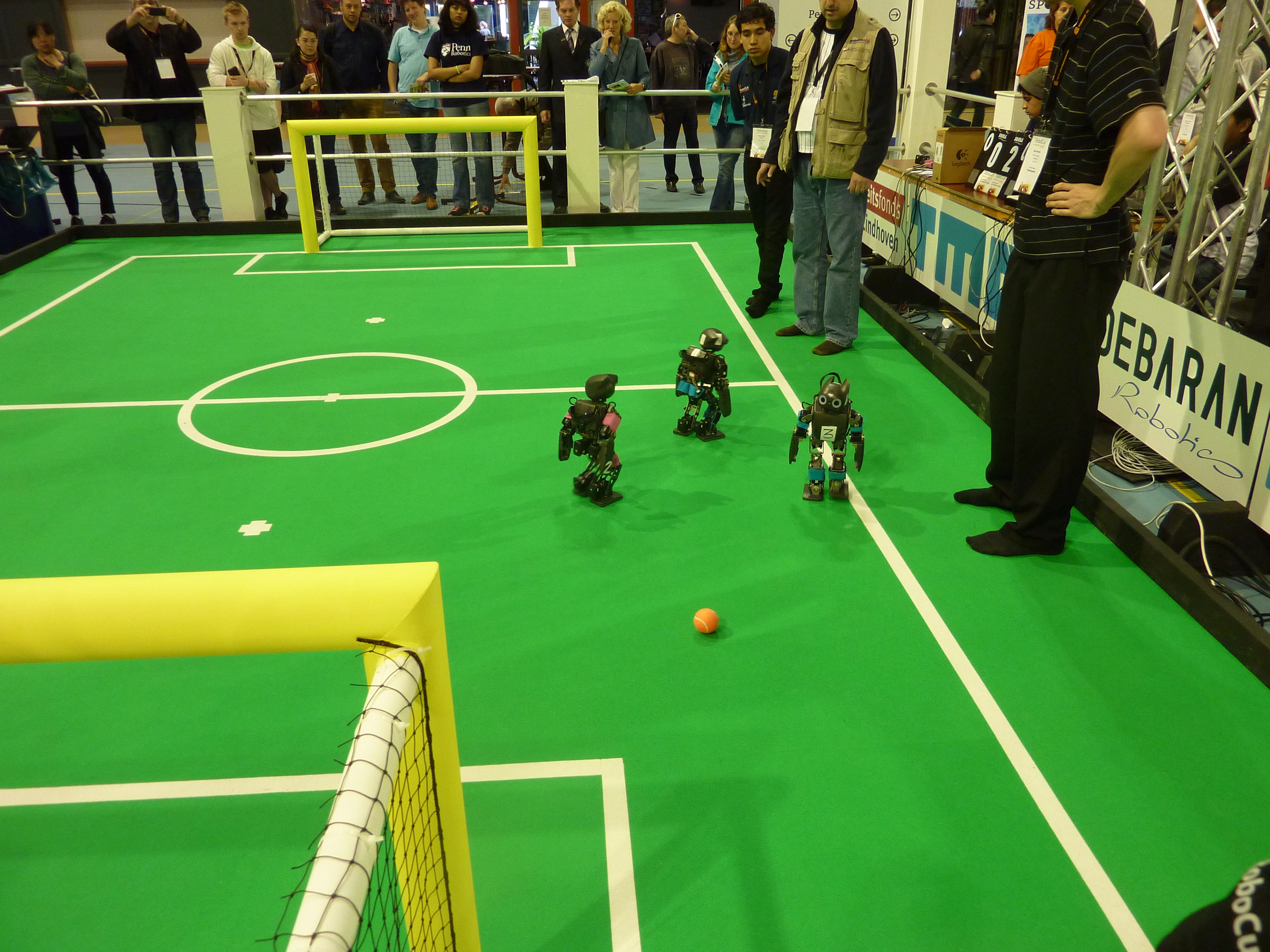 Von den Menschen auf dem Feld gelang niemandem eine nennenswerte Aktion, abgesehen von mehreren amüsanten Karambolagen und Pirouetten um die eigene Achse. Später wurde jedoch ein Roboter aus der Teen-Sized-League mit auf das Feld gelassen, der die menschlichen Spieler (im direkten Vergleich) dann auch prompt aus-dribbelte und ein Tor schoss.