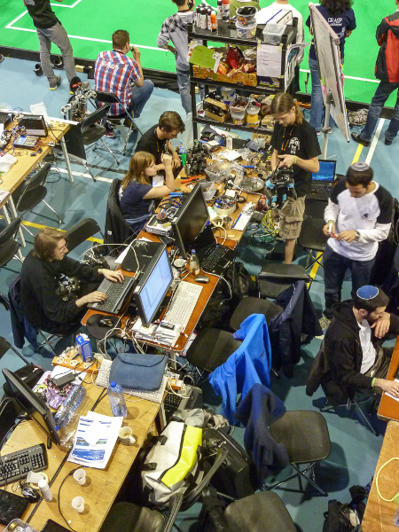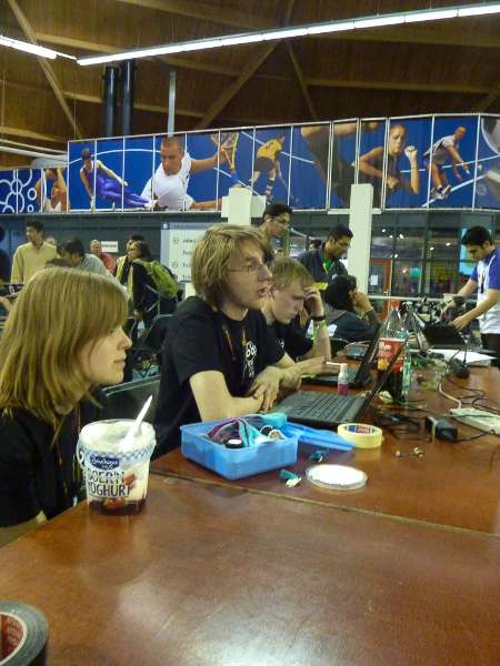 3 Mitglieder unseres Teams stellten sich spontan als Hardware zur Verfügung und wurden von der Software über das Spielfeld dirigiert.