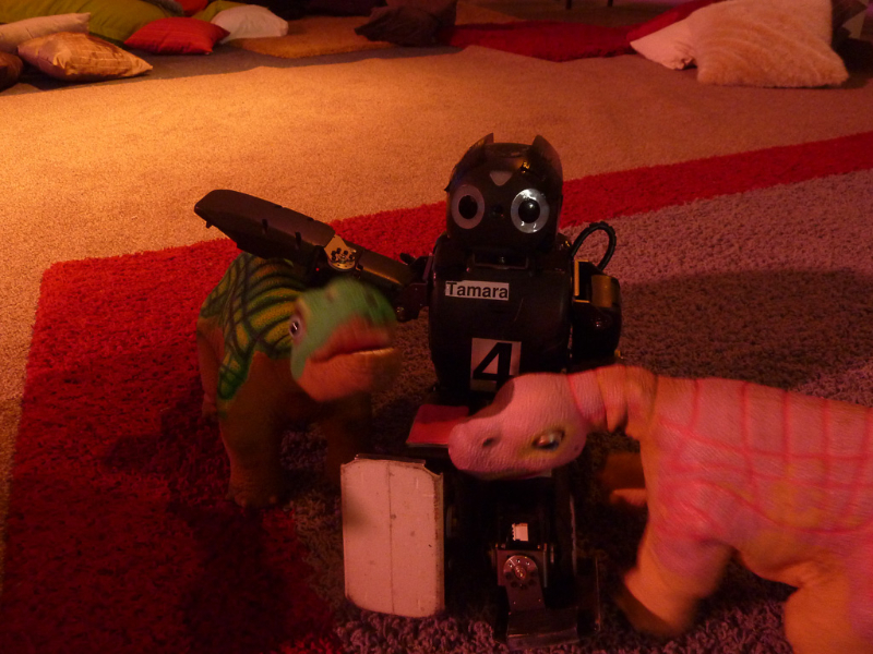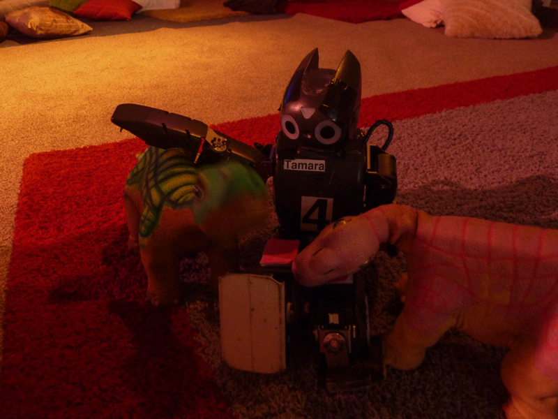 Am Nachmittag sind wir kurz mit Tamara auf den „Roboter Spielplatz“ gegangen – der merkwürdigerweise eher für menschliche Kinder ausgelegt zu sein scheint. Tamara hatte trotzdem ihren Spaß auf der Kuschelwiese einige Roboter-Dinosaurier zu streicheln.