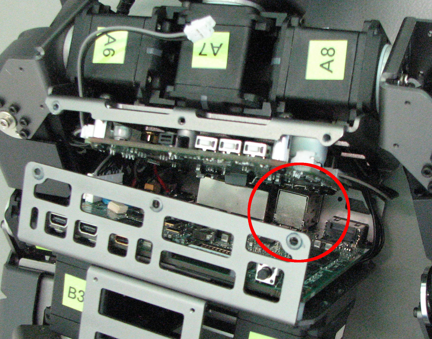 Um die USB-Rückwand zu entfernen, öffnet man einfach den Darwin (benutzt das „Assembly-Manual“) und geht zum Mainboard. Dann drückt man die Abdeckung vorsichtig mit einem flachen Schraubenzieher heraus (ohne das Board zu beschädigen!). Die USB-Ports bleiben weiterhin vollständig funktionsfähig und das Risiko, dass der Darwin einen „Herzanfall“ bekommt ist deutlich reduziert.