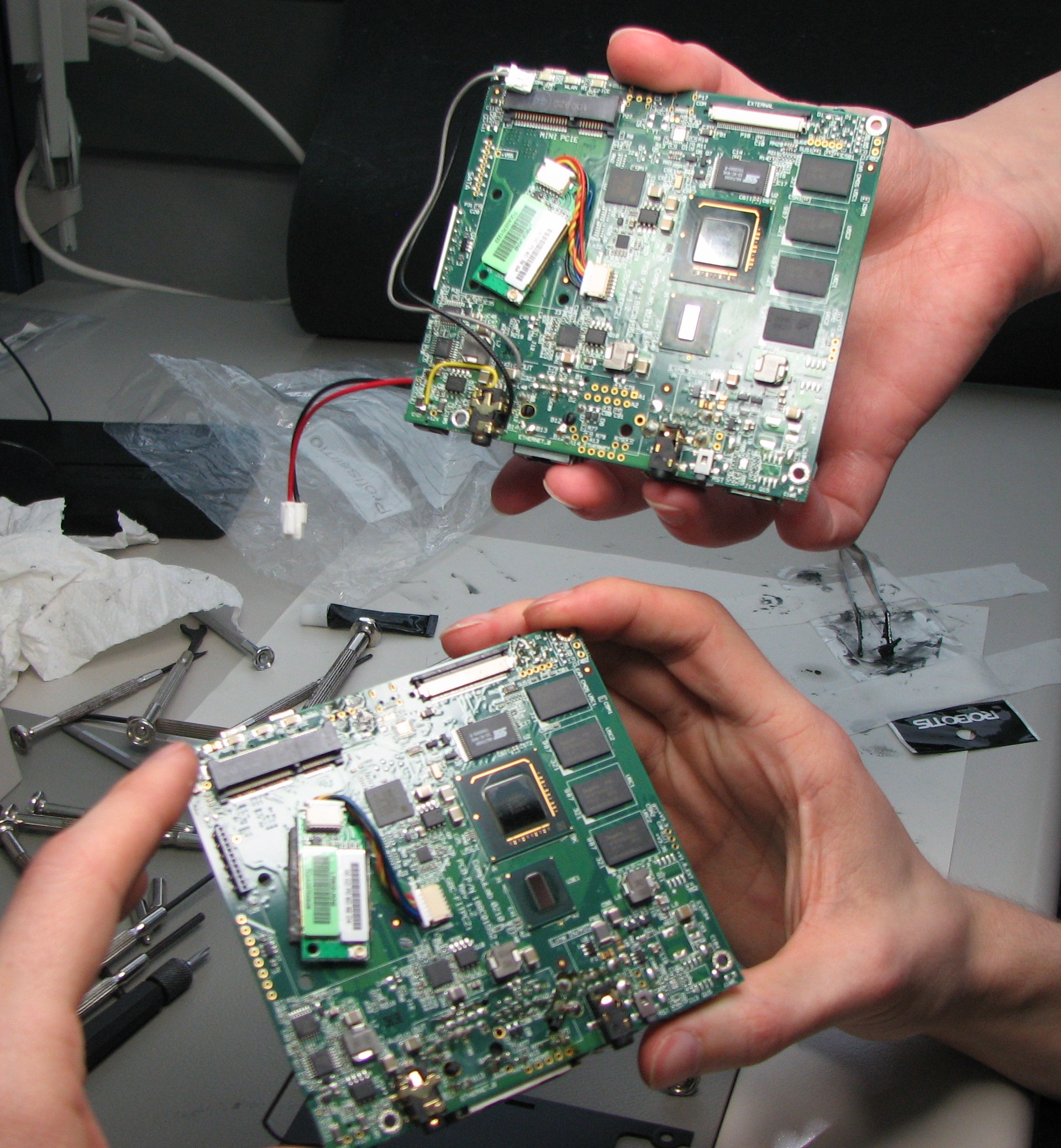 Zunächst ist es dem netten Menschen aus der TIS-Werkstatt gelungen die Anschlüsse von unserem alten Robotis-Mainboard auf unser neues Mainboard umzulöten.