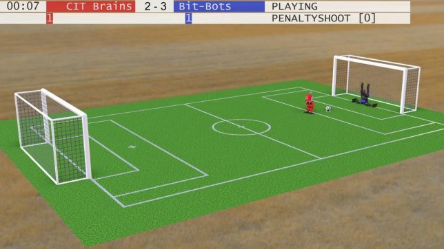 We got scared there, because from our tests we knew our penalty kicks can sometimes go inside the goal, but most of the time we would not hit the goal. However, the CIT Brains commentator told the viewers they had not tested their penalty behavior. So we got our hopes up again. During the first penalty kick, their robot took the ball and tried to dribble it into our goal. They were then removed from the playing area.