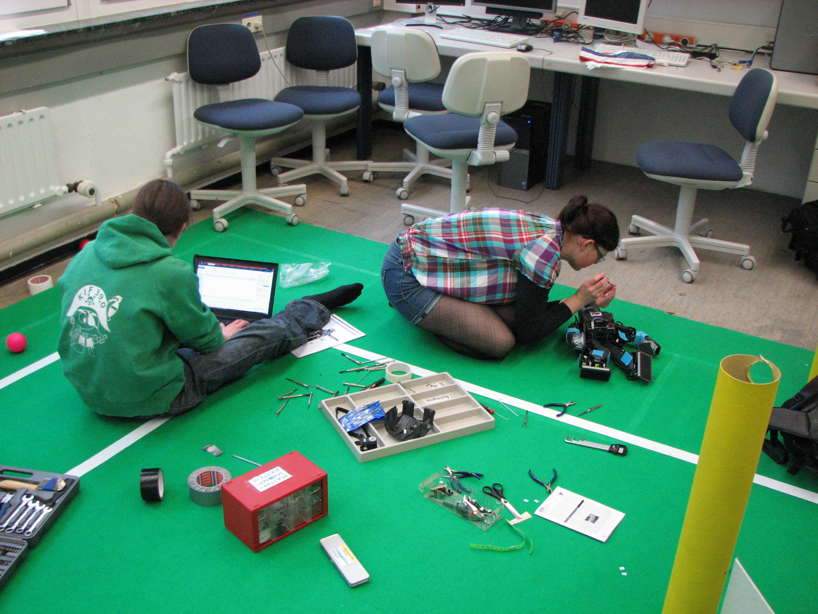 Heute haben wir versucht Wheatly wieder schmerzloses Aufstehen beizubringen. Da er unser einziger Roboter mit „Händen“ (wir nennen sie zumindest so) ist, gab es bei ihm Probleme, er muss sich noch an seine neuen Gliedmaßen „gewöhnen“.