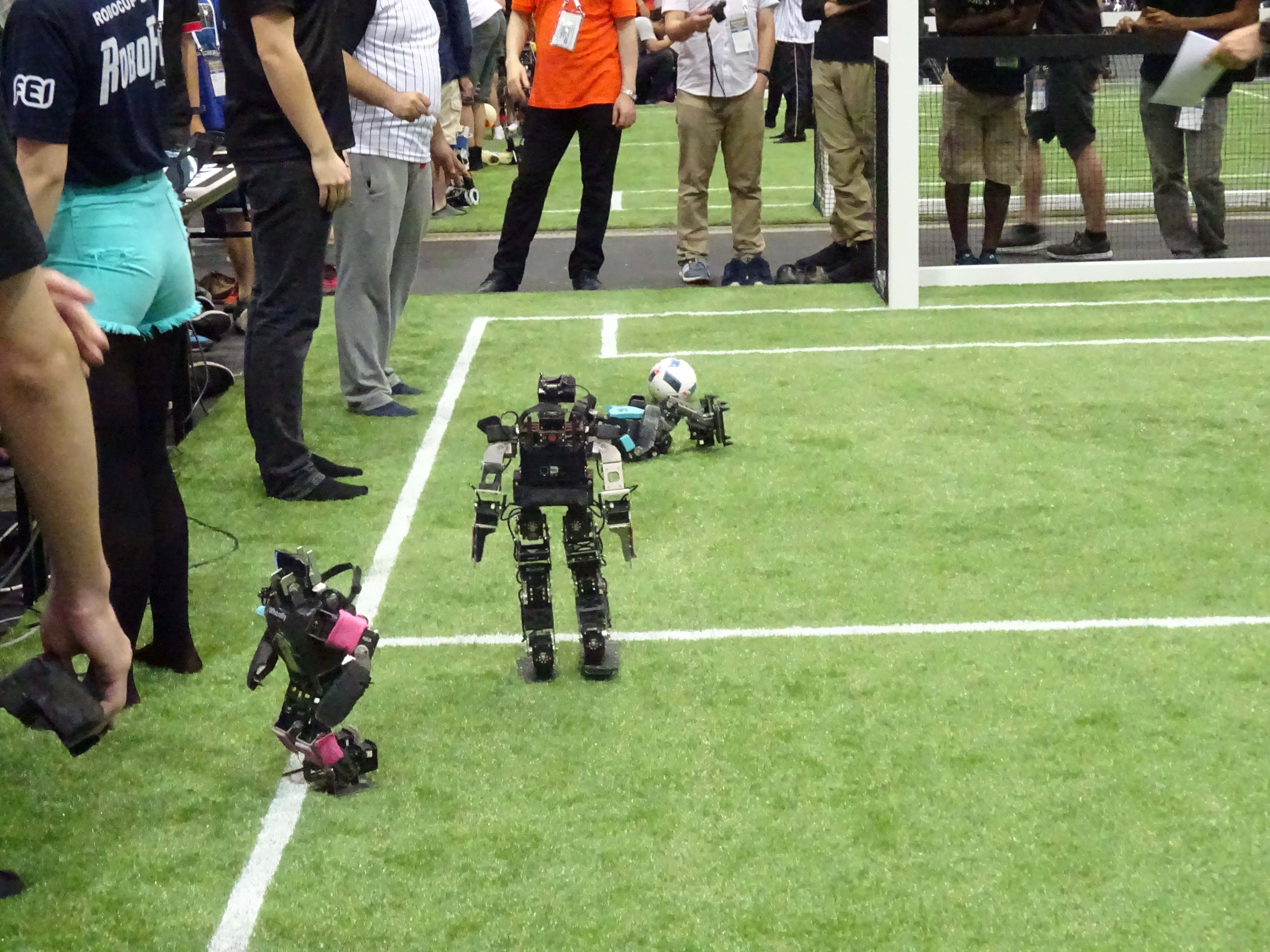 Rhoban als Gegner zu haben war für uns wie immer eine Herausforderung, aber mit inzwischen funktionierender Vision und optimiertem Laufalgorithmus haben wir uns ziemlich gut geschlagen. Einige Minuten vor Ende des Spiels gab es erneut große Verwirrung, als plötzlich die Stromversorgung unterbrochen wurde und somit alle bisherigen im Gamecontroller gespeicherten Ereignisse des Spiels gelöscht waren. Nach kurzer Beratungszeit der Schiedsrichter war aber alles wieder in Ordnung und das Spiel konnte beendet werden.